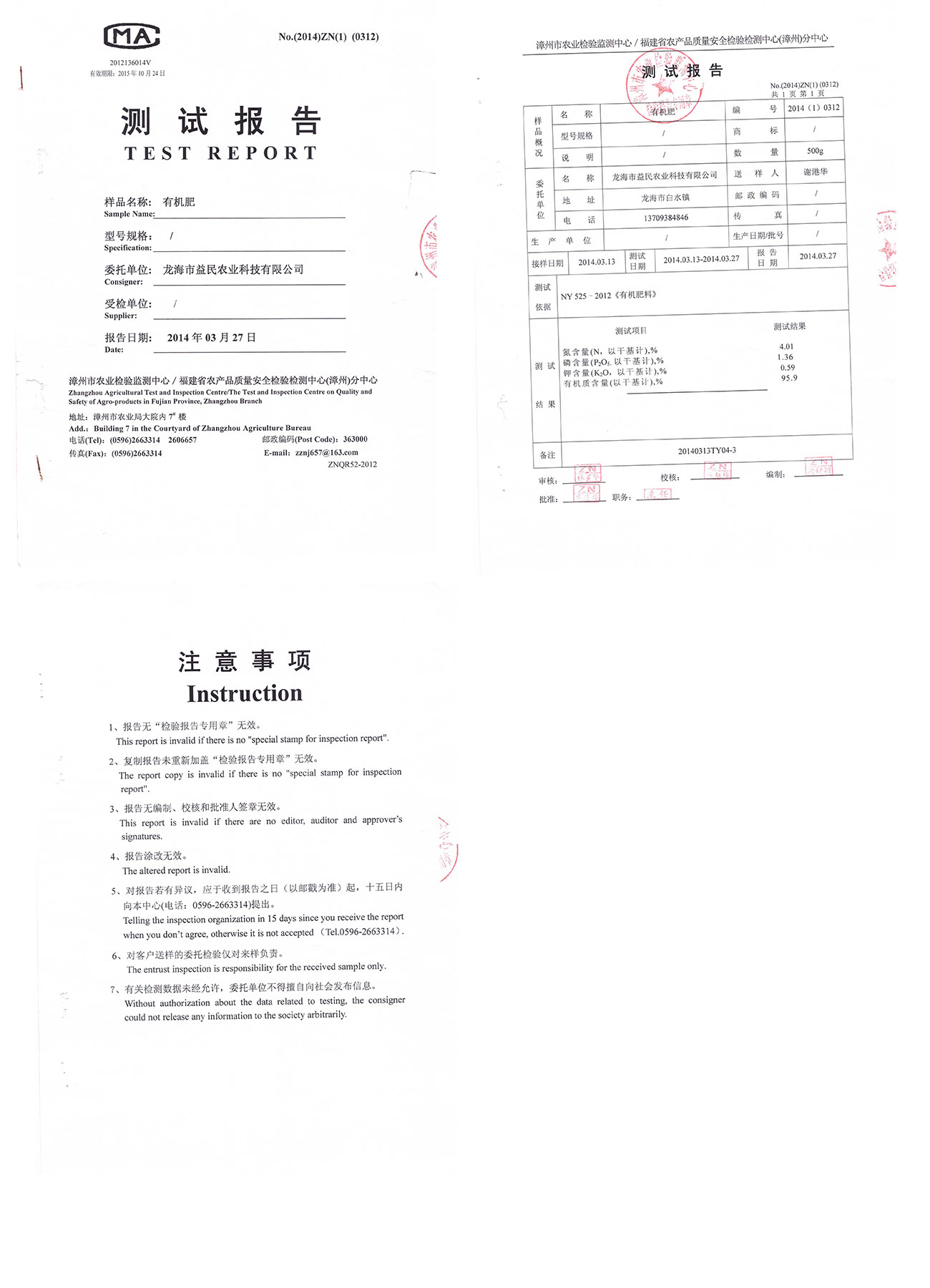 漳州市農業(yè)檢驗檢測中心測試報告 有機肥1