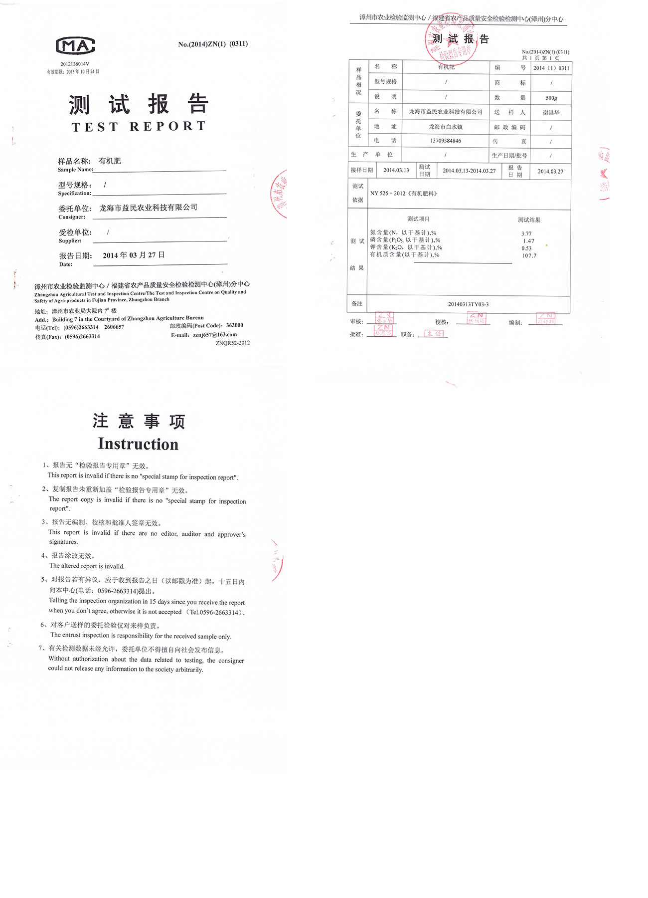 漳州市農(nóng)業(yè)檢驗(yàn)檢測中心測試報(bào)告 有機(jī)肥2