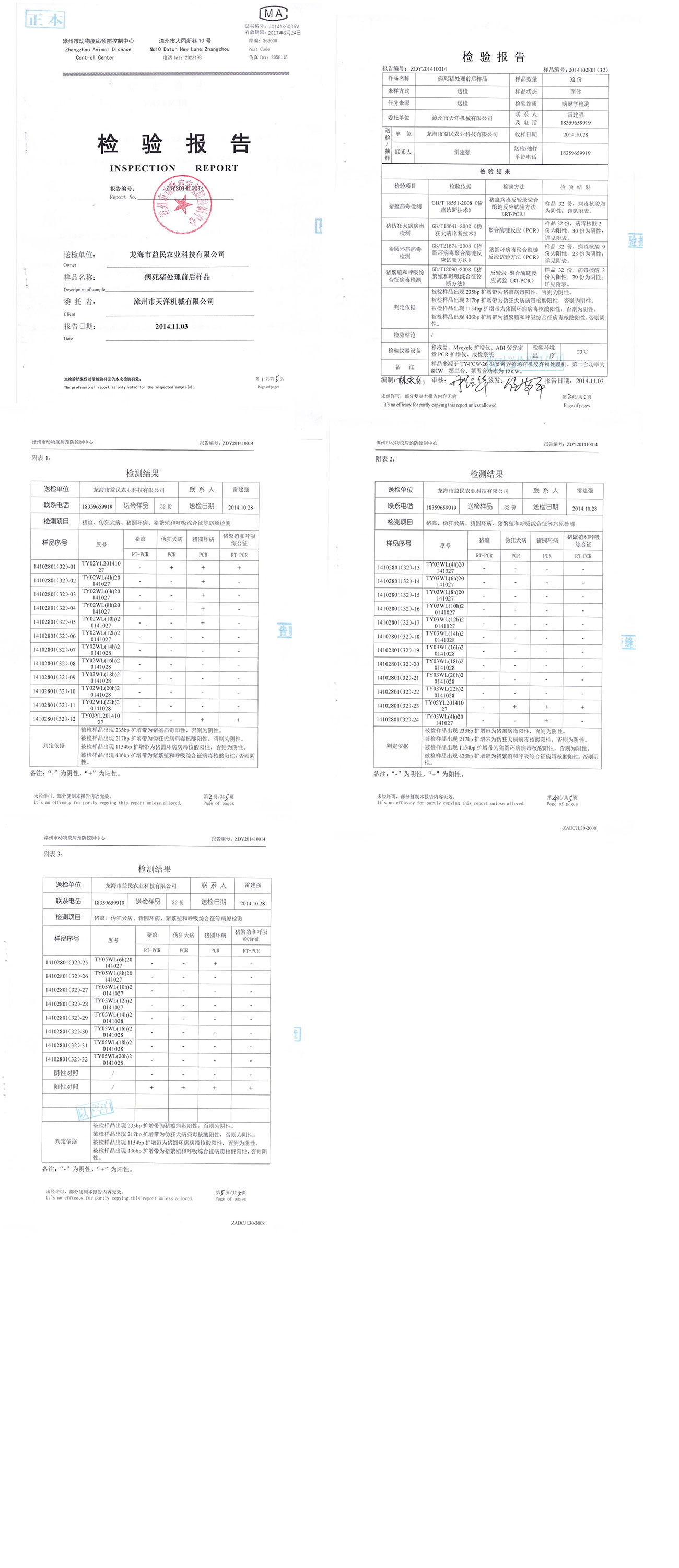 漳州市動物疫病預(yù)防控制中心檢驗(yàn)報(bào)告--病死豬處理前后樣品檢驗(yàn)